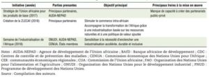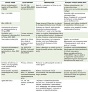 Depuis les années 1980, les institutions africaines ont lancé des initiatives pour favoriser l’essor de chaînes de valeur régionales et mondiales dans l’objectif plus large d’enclencher la transformation de la production. Le tableau ci-dessous présente ces initiatives, en rappelant leurs principaux objectifs et les écueils rencontrés lors de leur mise en œuvre. En 2003 par exemple, l’Initiative pour le renforcement des capacités productives de l’Afrique a défini deux objectifs pour le développement de CVR, à atteindre d’ici 2015 : i) la production de « marchandises qui répondent aux exigences de qualité des marchés actuels » ; et ii) la nécessité de « monter en gamme pour capter de futurs marchés ». Chaque région s’était alors vu assigner une ou plusieurs chaînes de valeur à développer à l’horizon 2015 (Marti et Ssenkubuge, 2009).