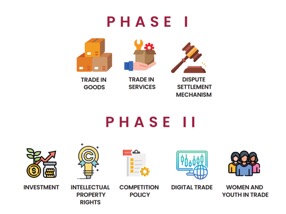 Comme illustré dans l’image ci-dessous, les accords de la ZLECAf dont la préparation et l’adoption s’étendu sur deux phases, sont structurés en huit (8) domaines chacun établissant un processus distinct de négociation, d’adoption et de ratification : (1) Commerce des biens, (2) Commerce des services, (3) Mécanisme de règlement de différends, (4) les Investissements, (5) La Propriété intellectuelle, (6) Politique de compétitivité, (7) Commerce électronique, et (8) Les femmes et les jeunes dans le commerce.