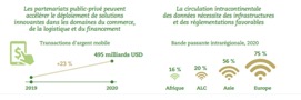 La pandémie de COVID‑19 et l’essor des marchés intérieurs accélèrent la transformation digitale de l’Afrique. Les nouvelles solutions dématérialisées, en particulier dans la logistique et les services financiers, pourraient notamment faire baisser les coûts, toujours élevés, de la production et du commerce intra‑africains. La transformation digitale des réseaux de production crée également des attentes supplémentaires pour une circulation fluide et sécurisée des données à travers les frontières. Les gouvernements peuvent contribuer au déploiement de solutions innovantes en matière de logistique commerciale et de financement. Les échanges africains sont souvent freinés par des problèmes liés à la logistique, au financement du commerce ou aux règlements. Les coûts logistiques en Afrique sont ainsi trois à quatre fois plus élevés que la moyenne mondiale (Plane, 2021). Le déficit de financement du commerce de l’Afrique, mesuré de manière grossière par la valeur totale des demandes de financement du commerce extérieur rejetées par les banques, ressortait à 81.8 milliards USD en 2019 – restreignant ainsi la capacité des producteurs africains à être compétitifs sur les marchés internationaux. De même, les paiements transfrontaliers en Afrique sont coûteux et souvent retardés. Ces goulets d’étranglement pénalisent particulièrement durement les microentreprises et les PME. Ainsi, alors qu’elles représentent 80 % des entreprises en Afrique, elles n’ont bénéficié que de 34 % du financement du commerce en 2019 (BAD et Afreximbank, 2020). Ce sont aussi elles qui créent la majorité des emplois.