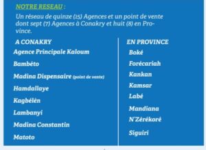 Un réseau de quinze (15) Agences et un point de vente dont sept (7) Agences à Conakry et huit (8) en Province.